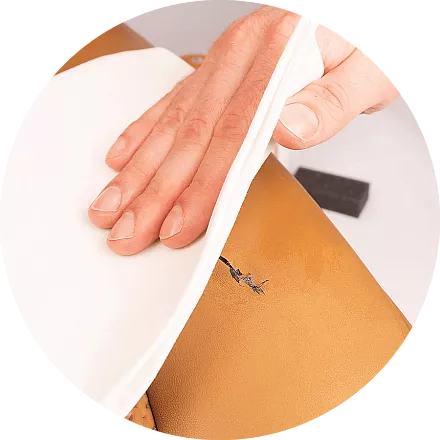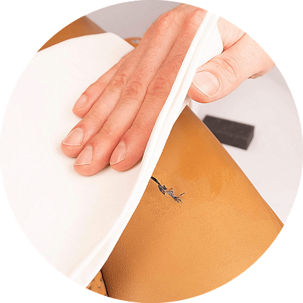 Смочите чистую мягкую ткань обезжиривателем и пройдитесь по жирным участкам. Гладкую кожу однотонного цвета можно полностью обезжирить после теста. С другой стороны, в случае кожи с открытыми порами (замша, анилиновая кожа и т. д.) следует лишь слегка провести тканью по коже, чтобы избежать следов и пятен от попытки очистки. Всегда давайте коже сначала высохнуть между нанесениями. Не используйте фен.