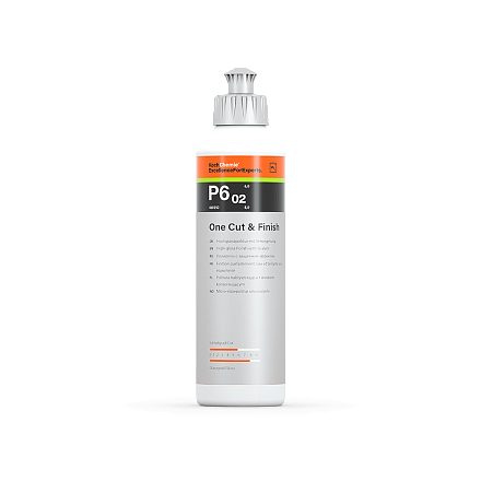 One Cut & Finish P6.02 — предназначена для машинной полировки, обеспечивающая полное удаления следов предыдущей полировки, голограмм, мелких царапин и следов шлифовки с зернистостью от P 2000 c одновременным герметизирующим эффектом. Благодаря использованию гоммогенного абразивного зерна обеспечивается долгосрочный эффект благородного глянца. Инновационная полироль One Cut & Finish P6.02 объединяет в себе оптимальное соотношение абразивности и глянца, обеспечивающее экономичность и эффективность работ по детейлингу автомобиля. One Cut & Finish P6.02 эффективна, хорошо полируется и легко удаляется с поверхности. Содержит карнаубский воск и нелетучие силиконы.