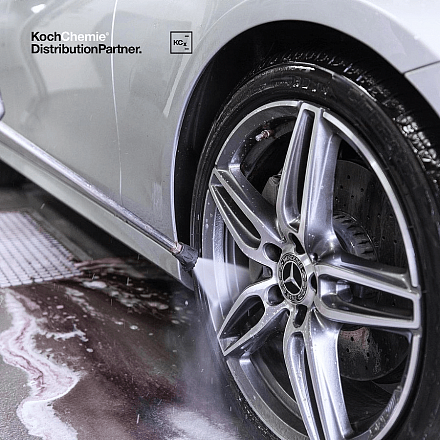Выждать до 5 минут и обильно смыть водой с помощью АВД. Можно применять щётку для глубокого очищения диска. Для работы на поверхности ЛКП можно применять пористую губку.